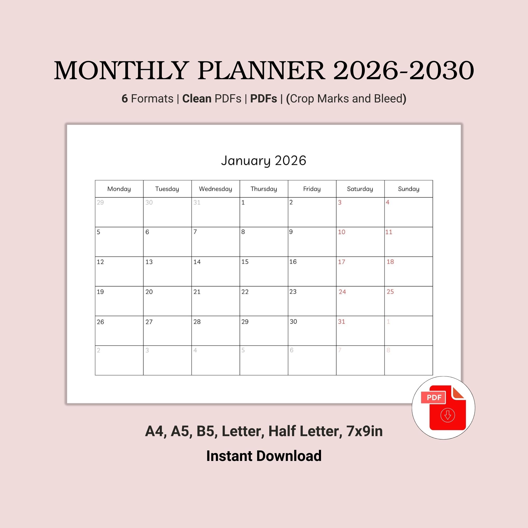 This 5-Year Landscape Monthly Planner offers a clear, wide-format view of your month, perfect for visual thinkers, horizontal planners, and anyone who prefers a side-by-side layout for long-range planning. Fully dated from 2026 through 2030, it gives you five years of uninterrupted structure.